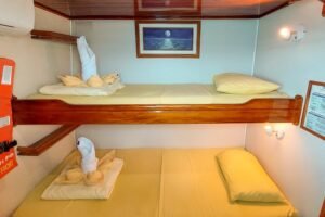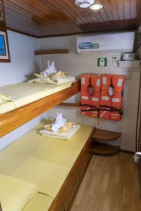 Die Aida Maria verfügt über 8 komfortable Doppelkabinen für jeweils 2 Gäste mit Etagenbetten. Alle Kabinen sind gleich groß, bieten die gleichen Annehmlichkeiten und haben den gleichen Preis. Sie verteilen sich auf drei Decks: 4 auf dem Hauptdeck, 2 auf dem Oberdeck und 2 auf dem Sonnendeck.